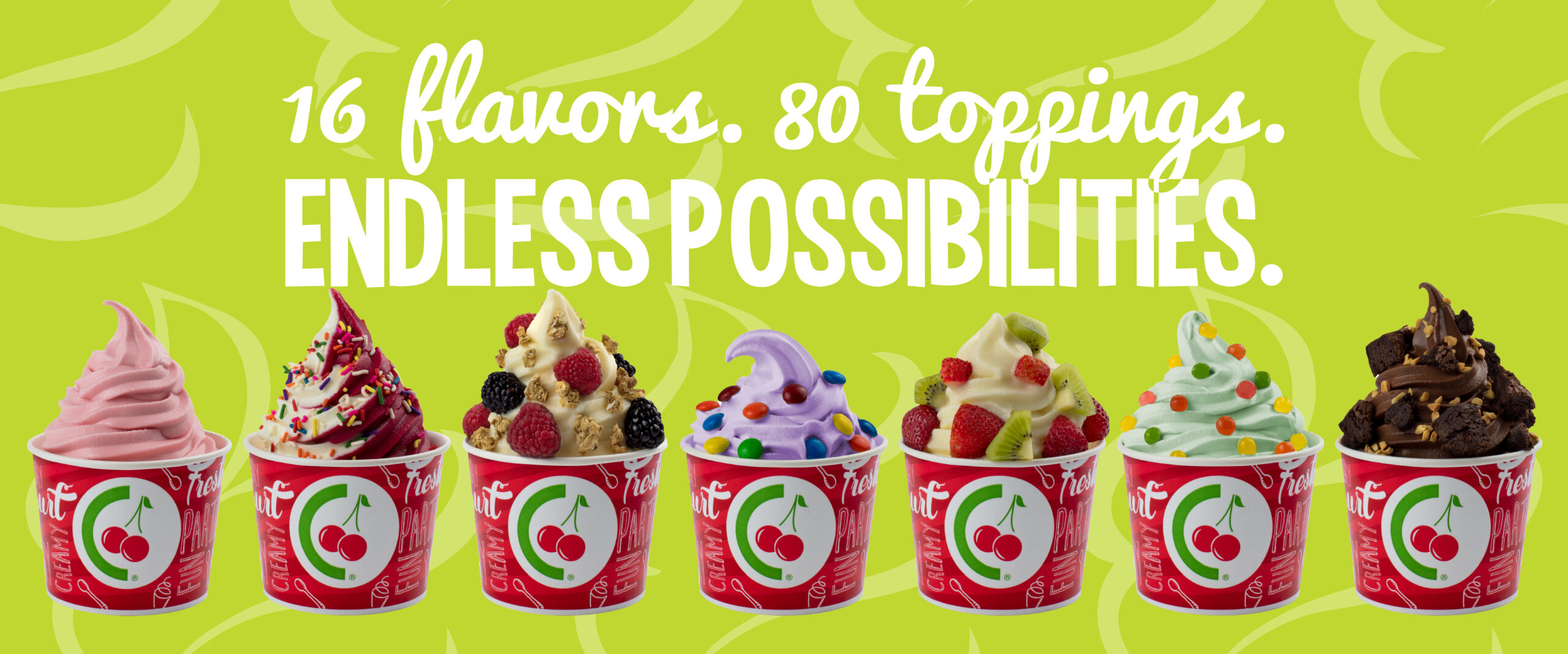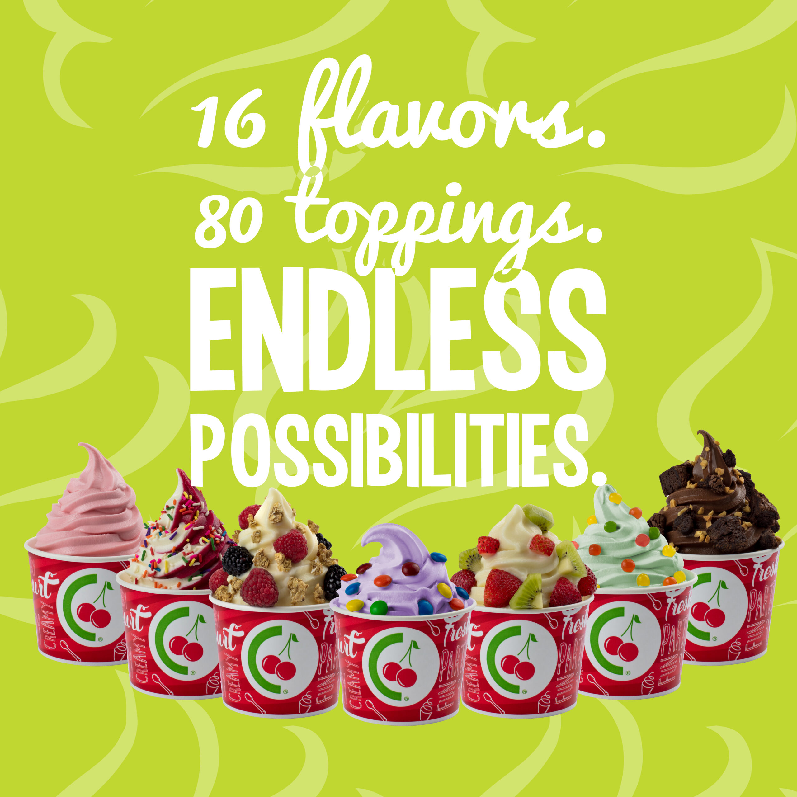 Choose from 16 delicious frozen yogurt and sorbet options with new, exciting flavors swirling every month.